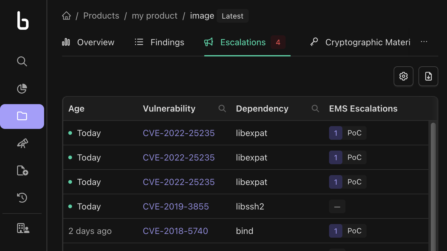 - Chronological Event Tracking: To see a detailed, time-ordered list of EMS Escalation events for a specific image, navigate to the Image Overview page. Within this page, you will find an Escalations tab that provides a chronological history of all exploitation maturity changes.