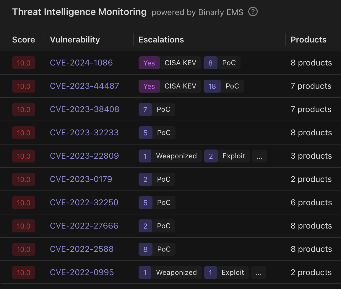 - Threat Intelligence Monitoring Widget: This widget can be found on the global dashboard and Image Overview and shows top 10 (by EMS Score) most pressing vulnerabilities present within the platform.