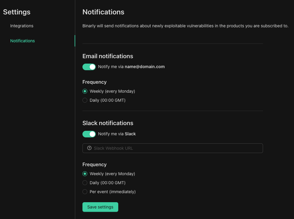 The following channels are available:- Email Notifications: Receive alerts directly in your inbox. You can choose to receive these alerts on a daily or weekly basis, providing a summary of relevant vulnerability Escalations. Emails will be sent to the address configured in the user account.
