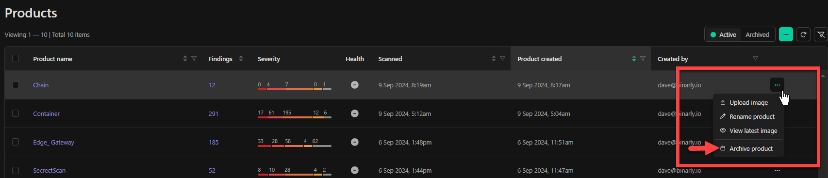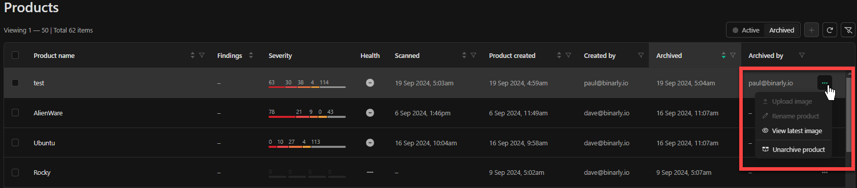 The Binarly Transparency Platform allows users to archive products to streamline the active grid view without permanently deleting data. Archiving helps manage the workspace by moving less relevant or inactive products out of the primary view.Archiving a Product