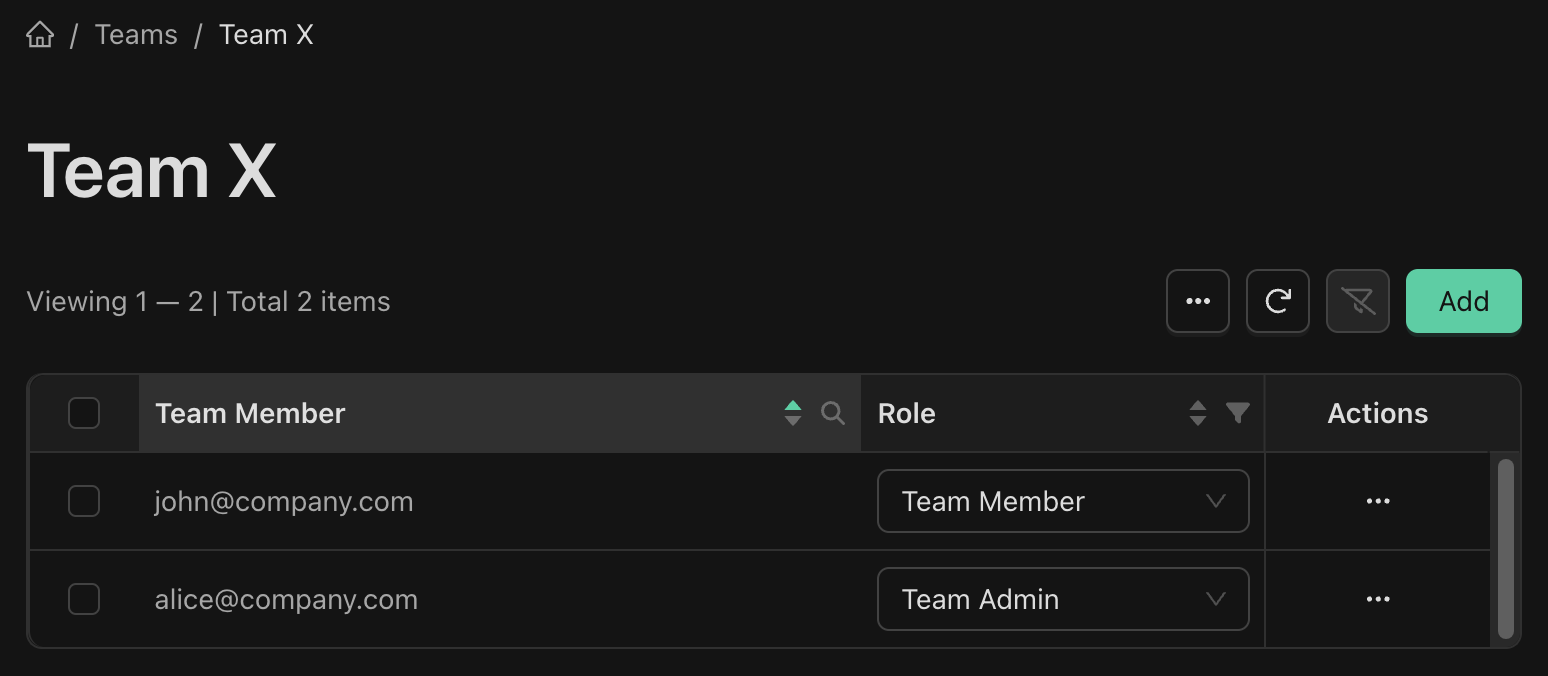 Teams streamline user management by allowing you to grant access to Products for a group of users at once. A single user can belong to multiple teams, providing flexibility in organizing your users. Within each team, there are two distinct roles:- Team Admins are members with elevated permissions, enabling them to manage the team itself. This includes adding or removing members and updating team details.
