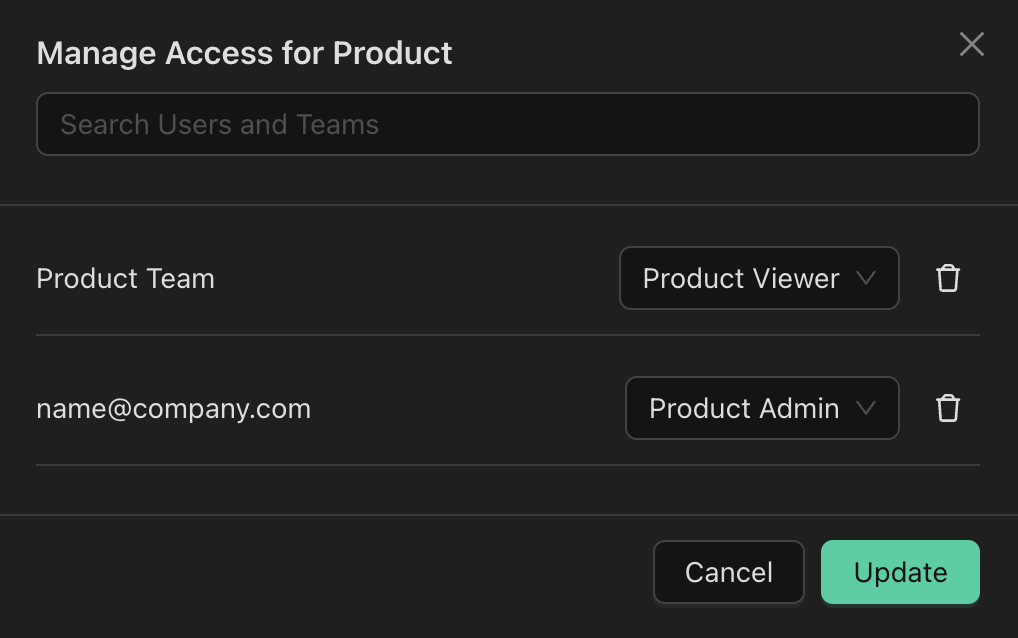 - Product Editor: Product Editors can perform almost all actions within a product, except for managing access control (adding/removing users and teams) and archiving the product.