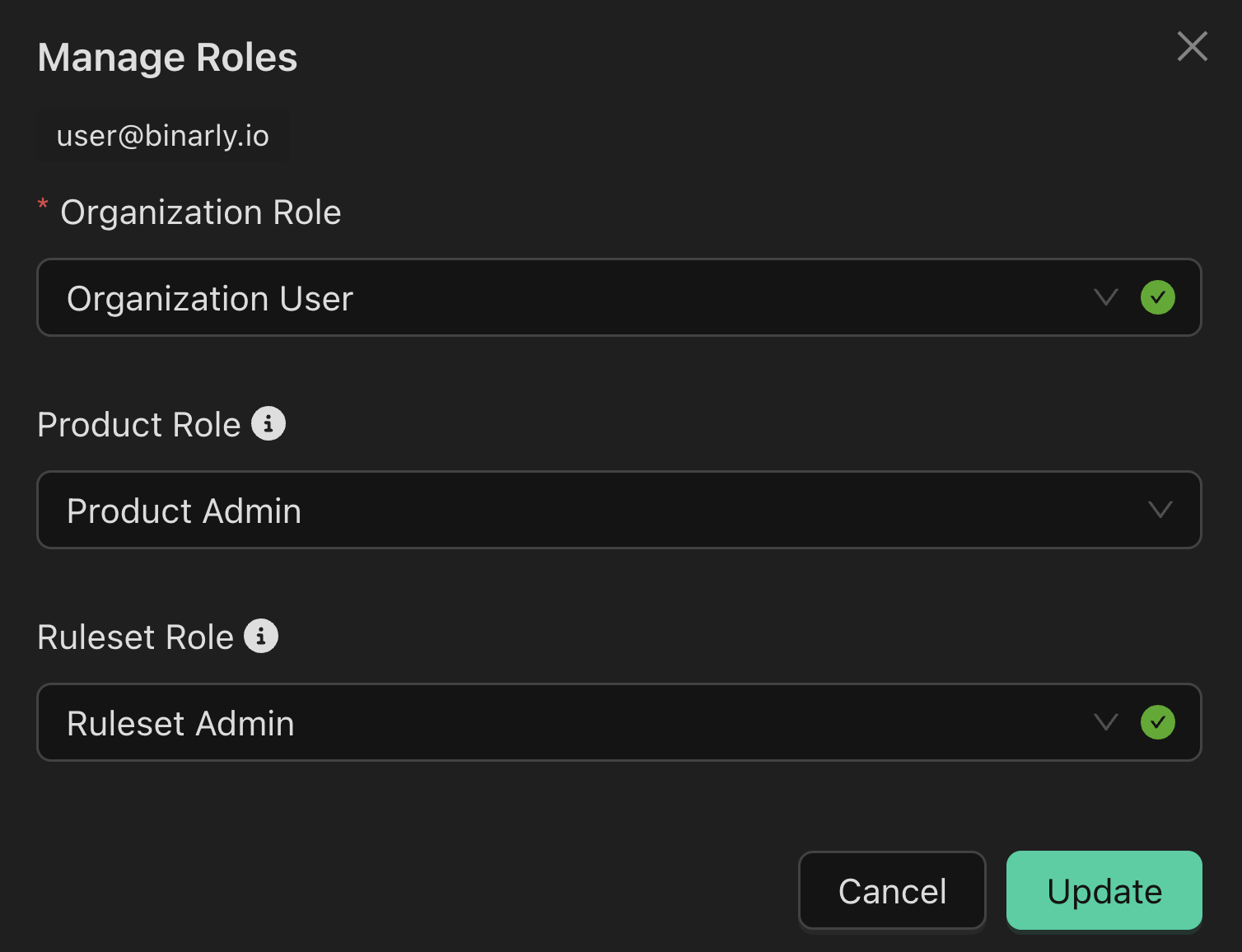 Product roles define specific levels of access to Products within an organization. These roles can be assigned at the Organization level (granting the role for all products), directly to users for a given product, or to an entire team for a given product. Hereβs a breakdown of the product roles:- Product Admin: Product Admins have the highest level of access to a product. They can manage access to the product by adding or removing users and teams.