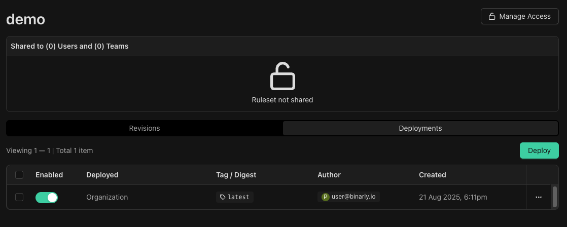 To deploy a Ruleset, navigate to “Rules Manager -> Rulesets” in the navigation menu. Select the desired Ruleset from the list and click on the “Deployments” tab. You will see a list of existing deployments for the selected Ruleset. To create a new deployment, click on the “Deploy” button.